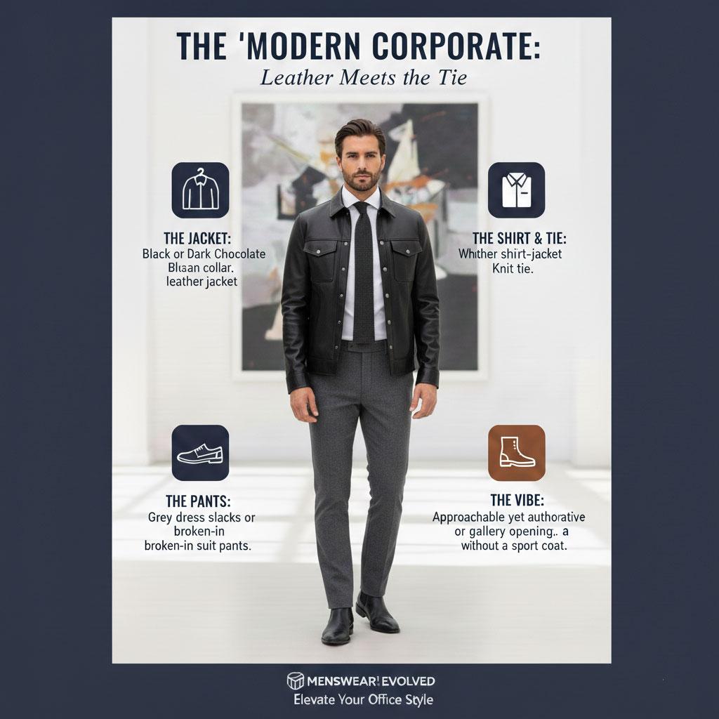 Warum es funktioniert: Das Leder fungiert als moderner Ersatz für ein Sakko und verleiht Ihnen eine nahbare und dennoch autoritäre Ausstrahlung.