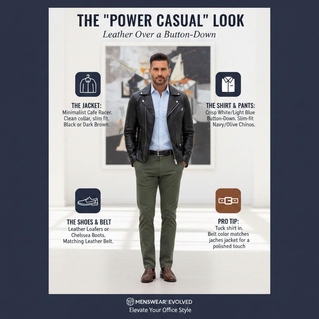 1. Der „Power Casual“-Look: Leder über einem Hemd