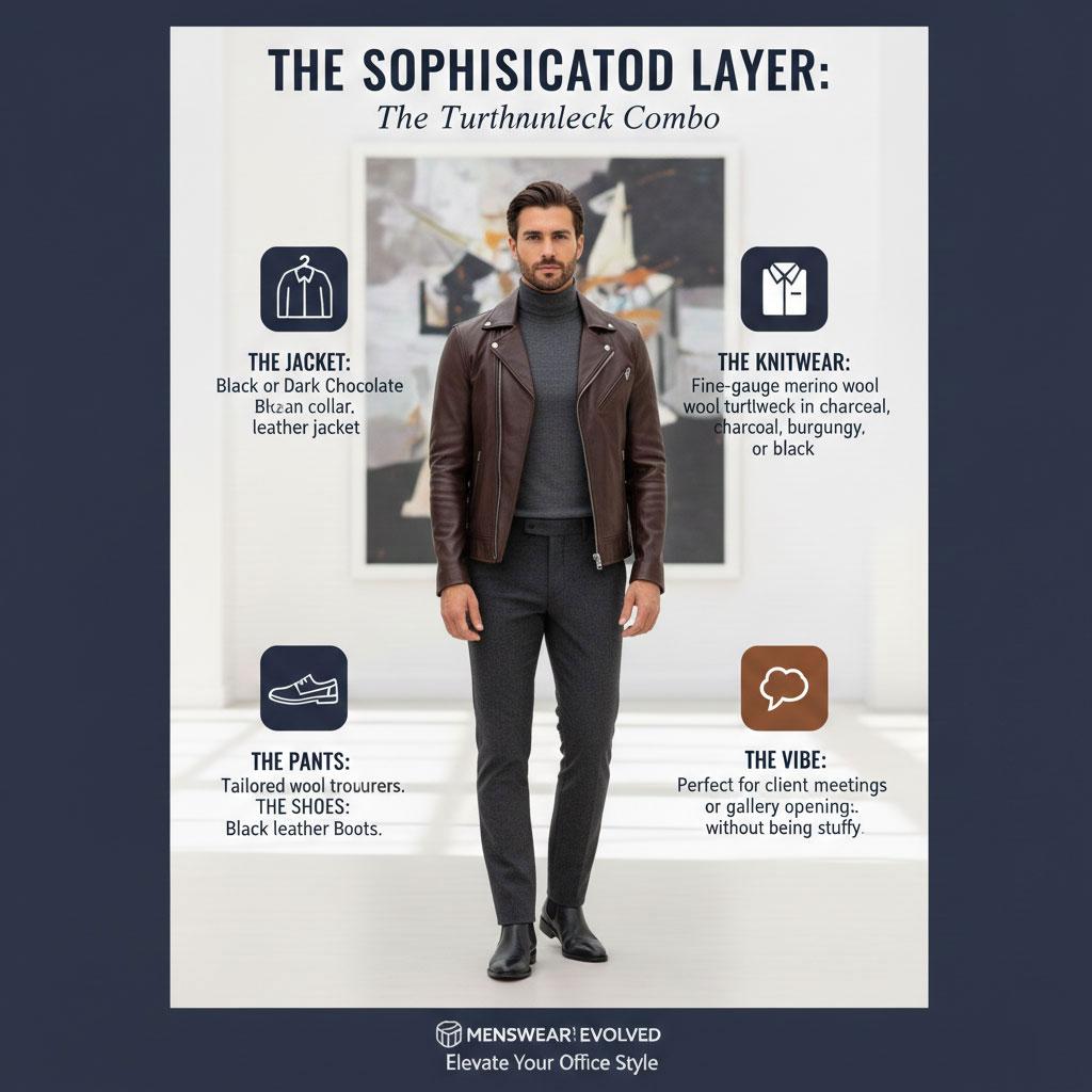 Wenn die Temperaturen sinken, ist der Rollkragenpullover der beste Freund des Mannes. Er ist elegant, streckt den Hals und strahlt puren „Creative Director“-Vibe aus. Die Kombination eines Rollkragenpullovers mit Leder schafft eine scharfe Silhouette, die unbestreitbar professionell wirkt.