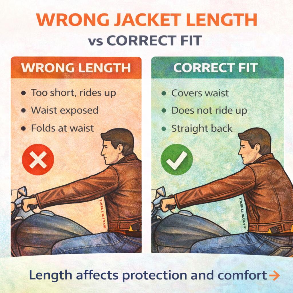 Eine Jacke, die zu kurz ist, rutscht während der Fahrt nach oben. Eine zu lange Jacke hingegen wirft im Sitzen unangenehme Falten oder drückt gegen den Tank.