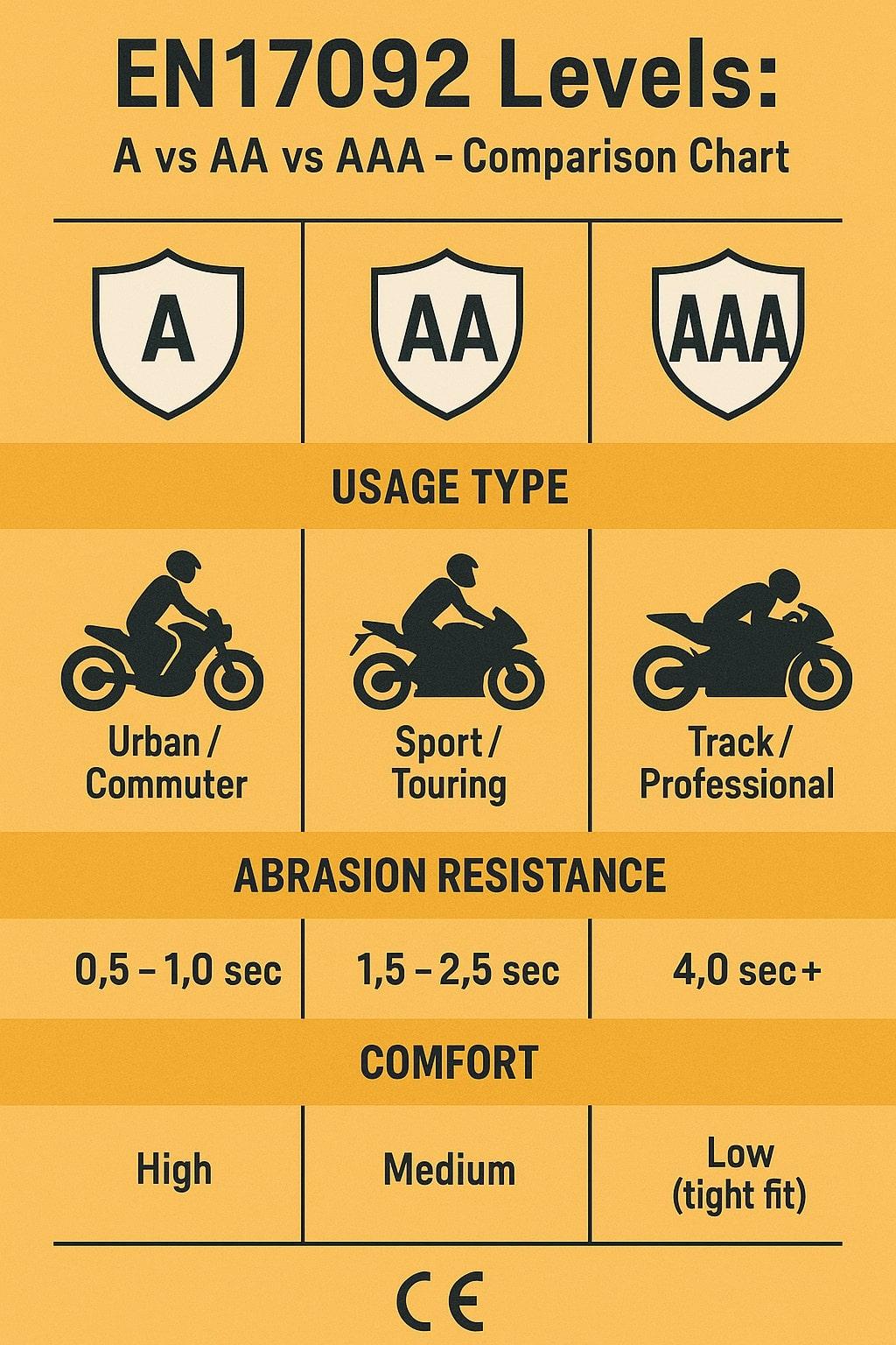 Stellen Sie sich einen Unfall bei niedriger Geschwindigkeit in der Stadt vor. Ausrüstung der Stufe A könnte Sie vor Schürfwunden bewahren. Auf der Autobahn könnte sich derselbe Anzug jedoch innerhalb von Sekunden abnutzen. Hier ist AA- oder AAA-Schutz die Rettung.