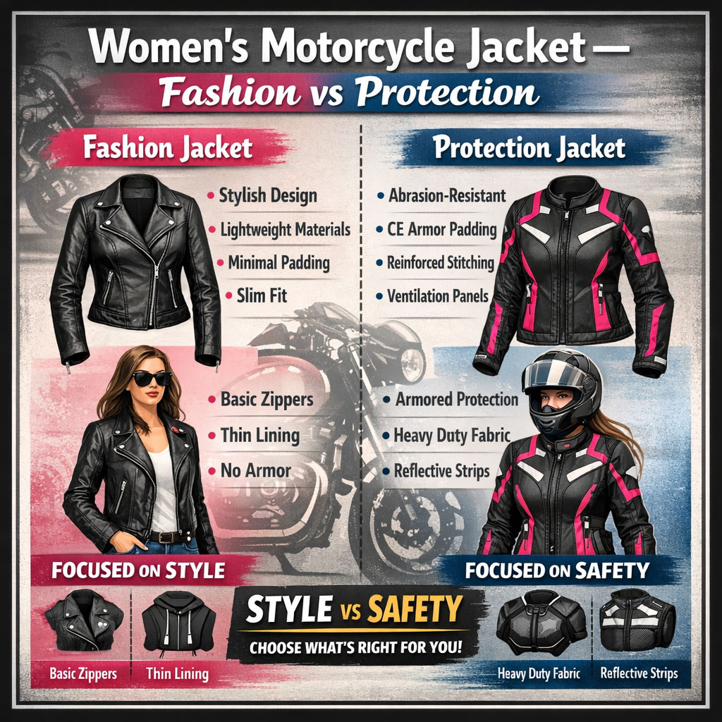 A fashion leather jacket focuses on appearance. A protective women's motorcycle jacket focuses on safety.