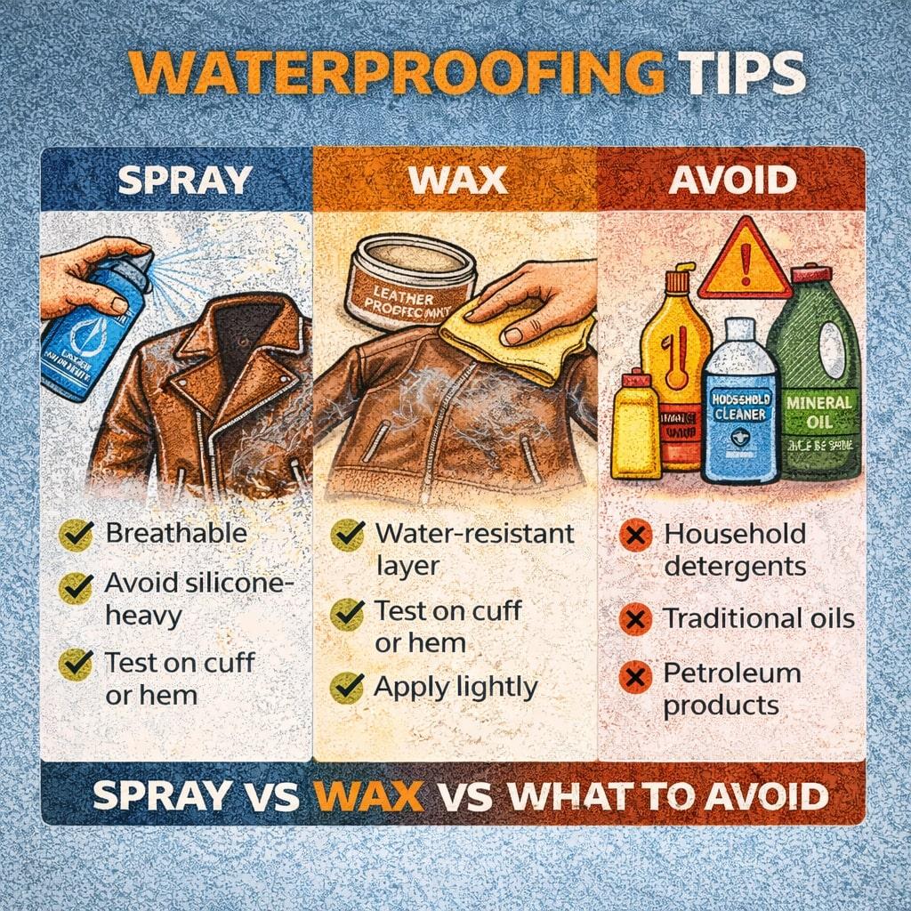 Wählen Sie ein atmungsaktives, wasserabweisendes Spray oder Wachs, das speziell für Motorrad-Lederbekleidung entwickelt wurde. Vermeiden Sie stark silikonhaltige Sprays, welche die Poren verstopfen.