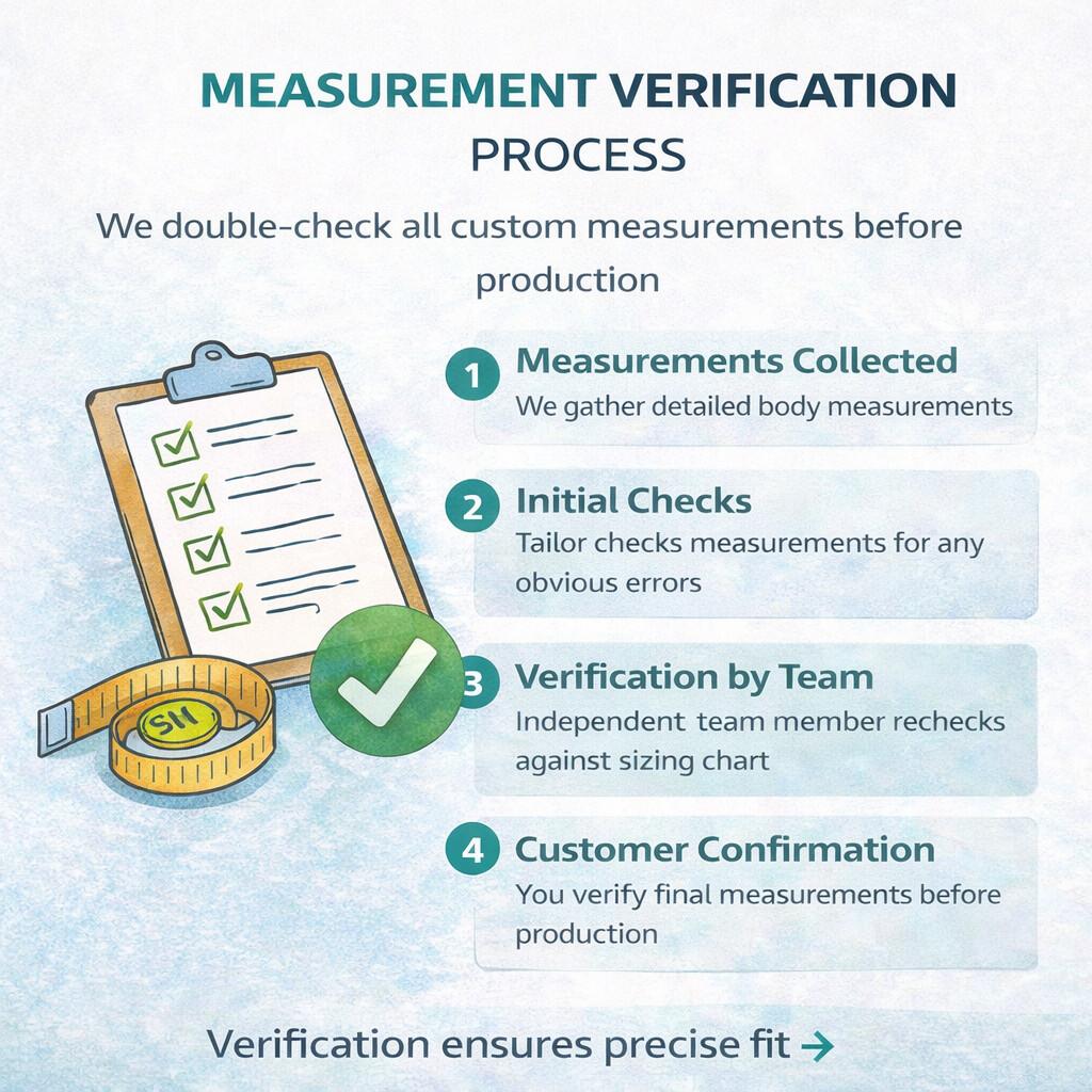 Sollten Sie sich für eine Standardgröße entschieden haben, überprüfen wir dennoch Ihre Angaben zu Größe und Gewicht. Wenn Sie eine Maßanfertigung gewählt haben, fordern wir detaillierte Körpermaße an.